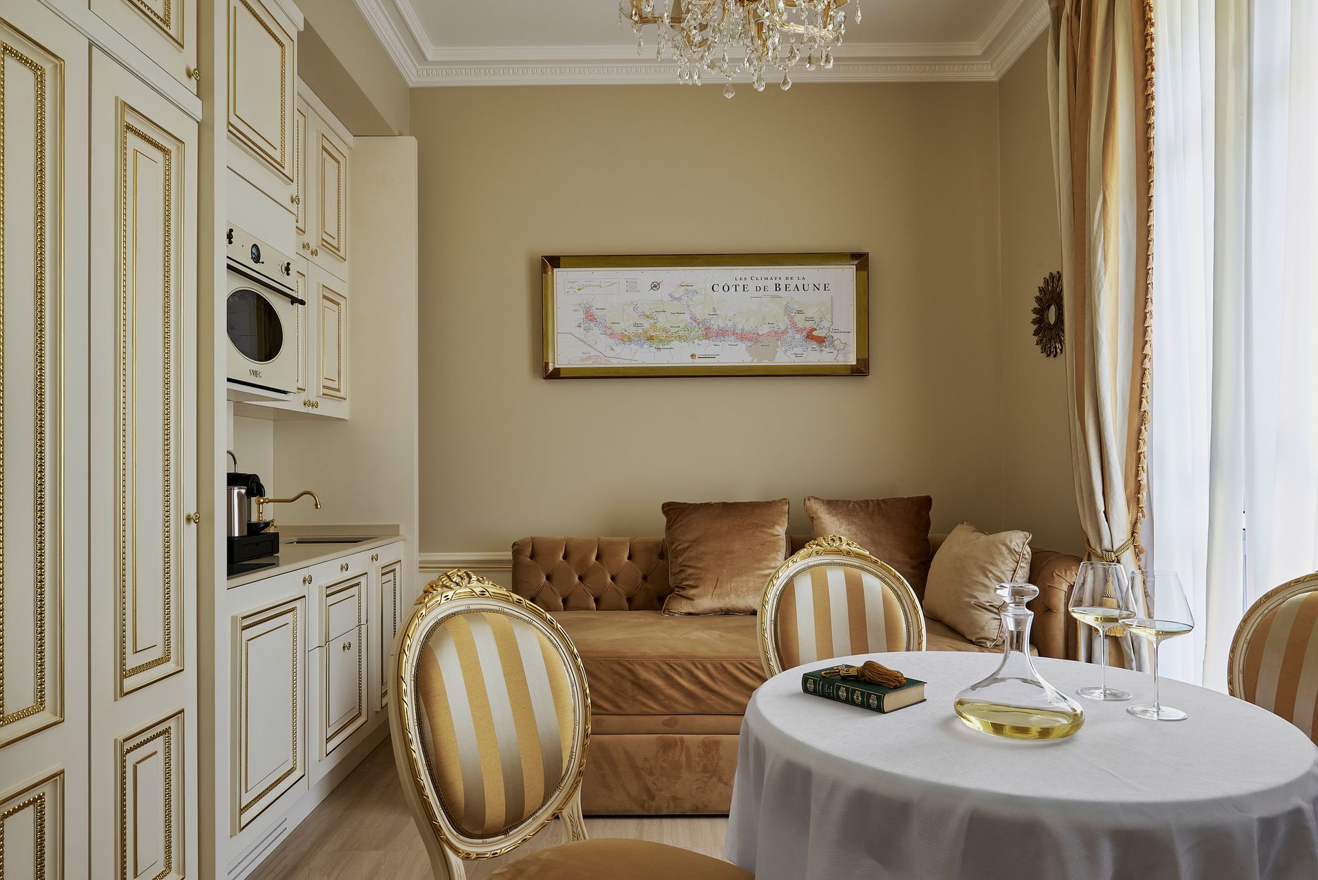 Découvrez la Suite Deluxe Meursault, un espace somptueux de 30 m² situé au rez-de-chaussée de notre hôtel. Décorée dans des tonalités dorées et profondes rappelant la robe de ce grand vin blanc bourguignon, cette suite offre un cadre spacieux et luxueux.